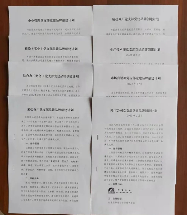 突出特色明确党建品牌。按照“一支部一品牌,一支部一特色”思路打造党建特色品牌。各党支部明确党建品牌,制定创建目标,完善创建措施,以 “服务中心、服务员工、服务企业、服务发展”为职责使命,开展创建活动。采盐分厂党支部创建了“党建引领,促生产、比创新”党建品牌;精盐分厂党支部创建了“忠于职守讲奉献、求真务实促高效”党建品牌;市场营销部党支部创建了“党建促营销,市场争先锋”党建品牌;生产技术部党支部创建了“谋远健行、综合提升”党建品牌;综合办(财务)党支部创建了“党建引领,全力奉献”党建品牌;企管党支部创建了“服务为本,提质增效”党建品牌;雅染实业党支部创建了“坚定信念葆先锋,党建引领谋发展”党建品牌;隆宝公司党支部创建了“ 红色引擎驱动安全绿色发展”党建品牌。